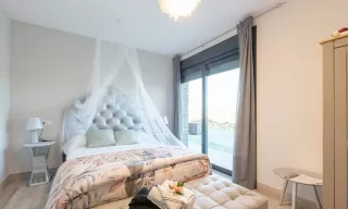 - Susana: en el interior de este dormitorio hay espacio para 3 personas que van a poder descansar en una amplia cama de matrimonio que se presenta con cabecero acolchado y tiene unas telas sobre la cama. También dispone de un cuarto de baño completo y adaptado, equipado con una ducha.