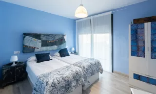 - Tristana: este dormitorio tiene capacidad para 3 personas y consta de un original cabecero hecho de retales de vaqueros, en el que se apoyan las 2 camas individuales. Junto a ellas, tenemos la puerta acristalada de acceso al exterior, así como de frente hay una zona de sillones, con la televisión de plasma y un cuarto de baño adaptado, equipado con una ducha.